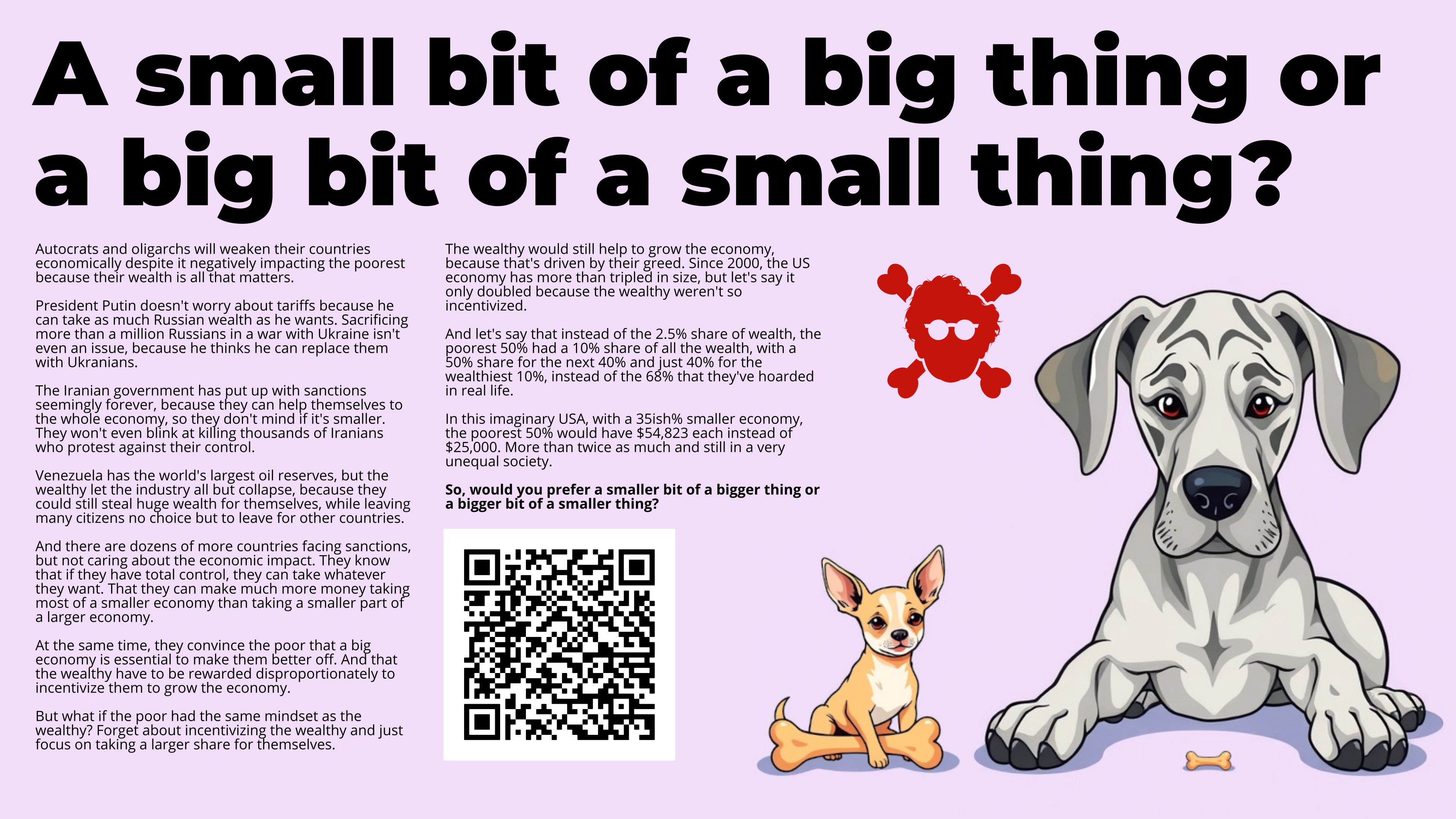 In this imaginary USA, with a 35ish% smaller economy, the poorest 50% would have $54,823 each instead of $25,000. More than twice as much and still in a very unequal society.
