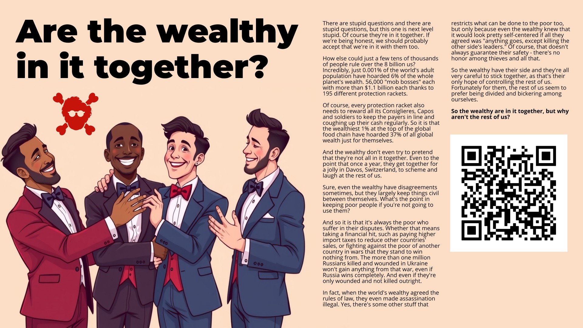 And the wealthy don’t even try to pretend that they’re not all in it together. Even to the point that once a year, they get together for a jolly in Davos, Switzerland, to scheme and laugh at the rest of us.