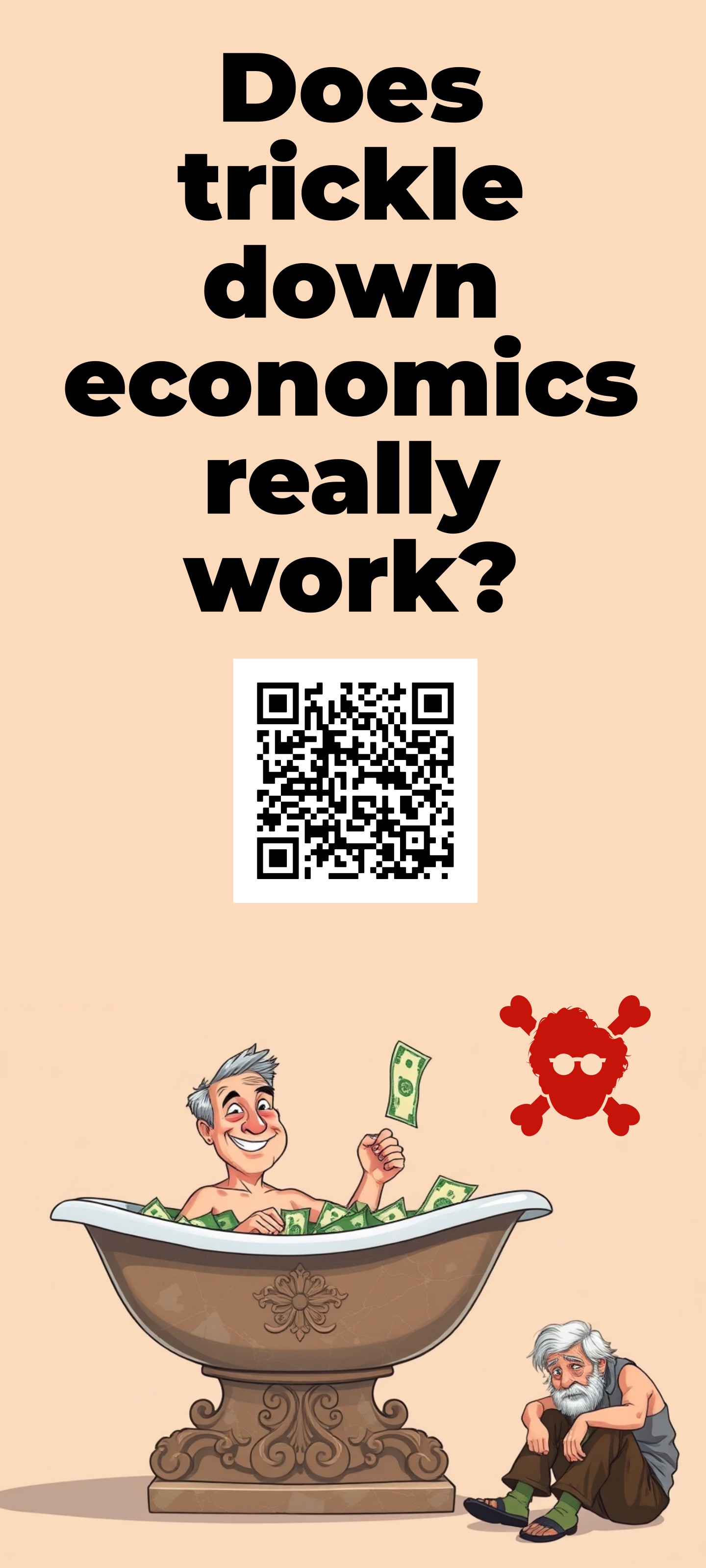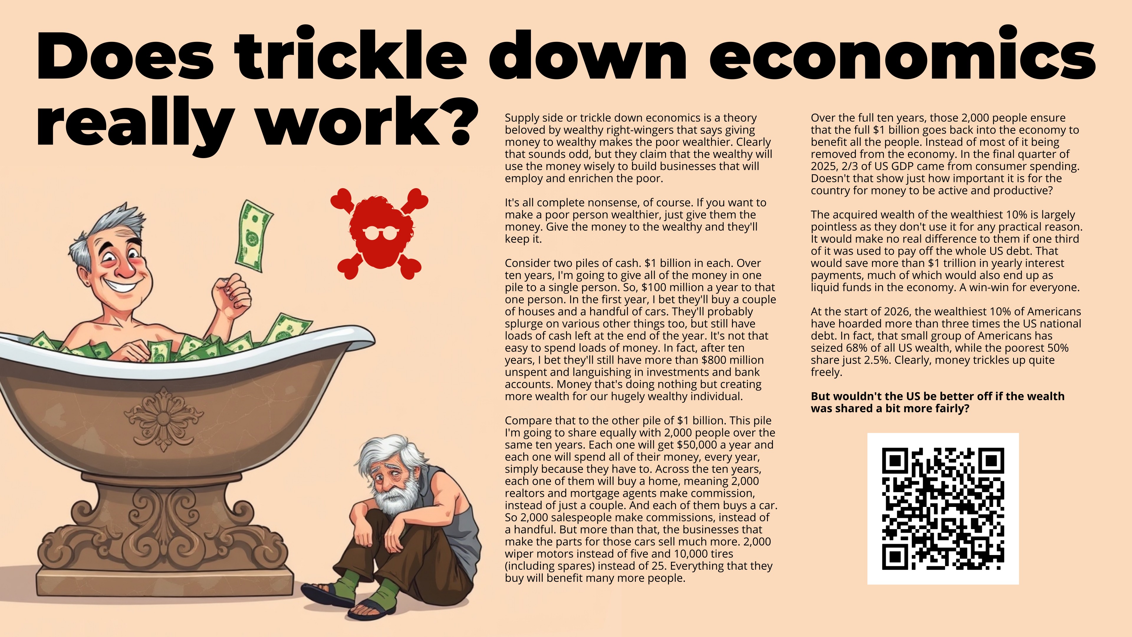 Supply side or trickle down economics is a theory beloved by wealthy right-wingers that says giving money to wealthy makes the poor wealthier. Clearly that sounds odd, but they claim that the wealthy will use the money wisely to build businesses that will employ and enrichen the poor.