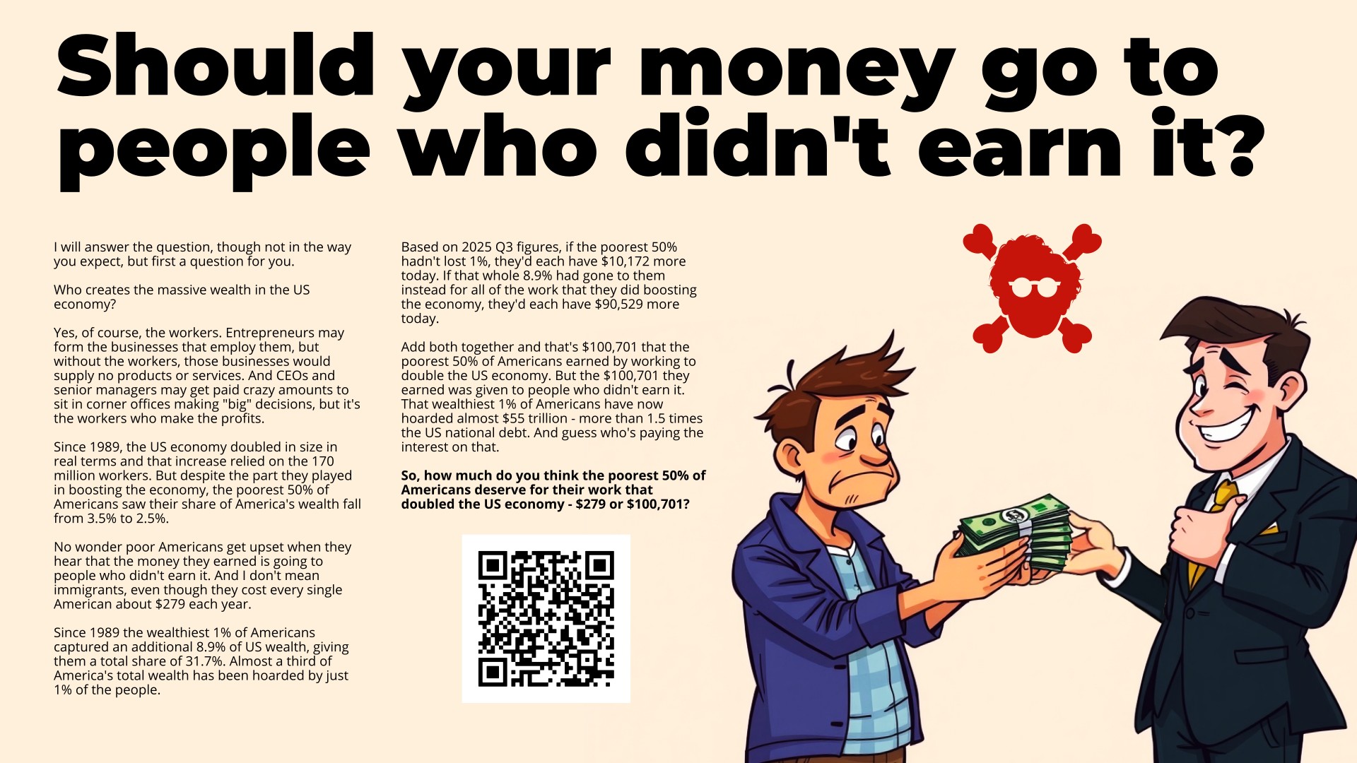 Based on 2025 Q3 figures, if the poorest 50% hadn’t lost 1%, they’d each have $10,172 more today. If that whole 8.9% had gone to them instead for all of the work that they did boosting the economy, they’d each have $90,529 more today.