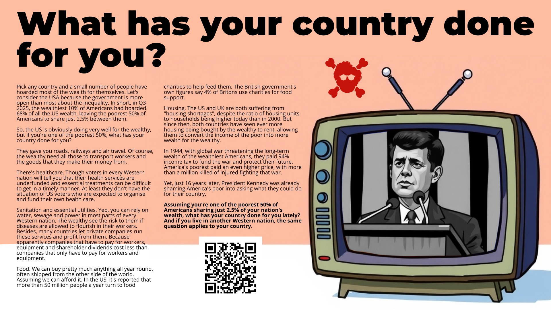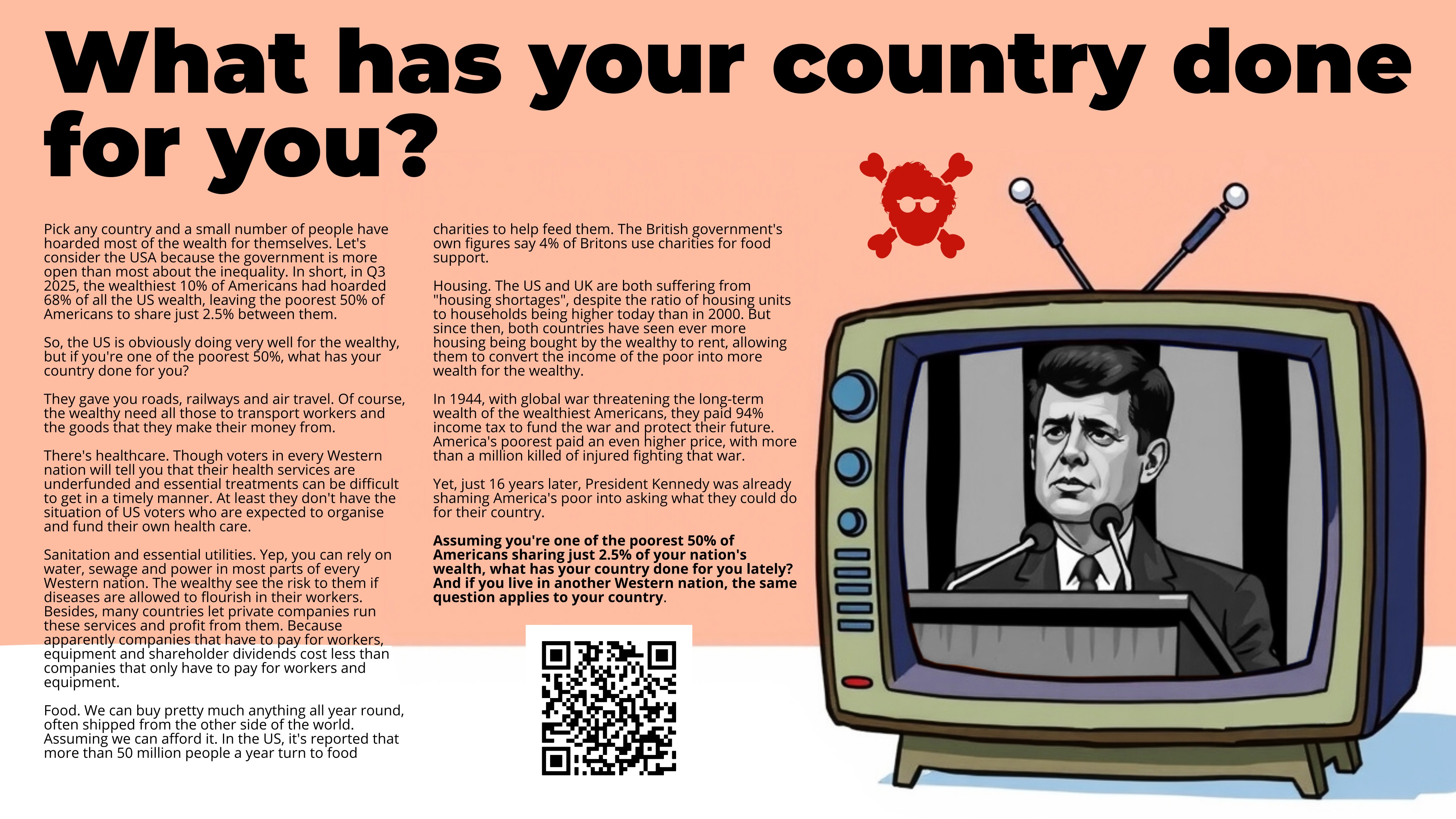 Assuming you’re one of the poorest 50% of Americans sharing just 2.5% of your nation’s wealth, what has your country done for you lately? And if you live in another Western nation, the same question applies to your country.