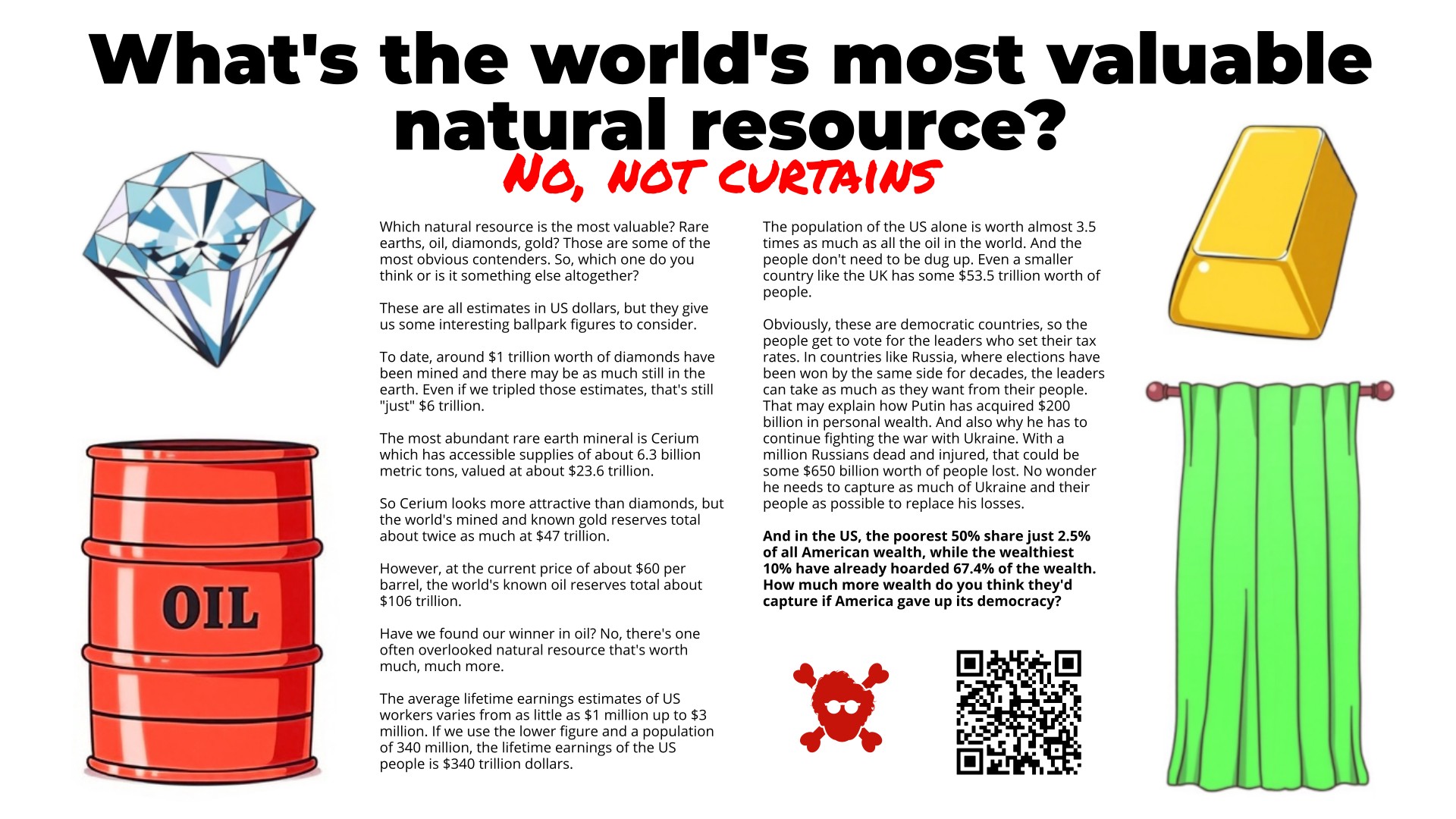 The population of the US alone is worth almost 3.5 times as much as all the oil in the world. And the people don’t need to be dug up. Even a smaller country like the UK has some $53.5 trillion worth of people.