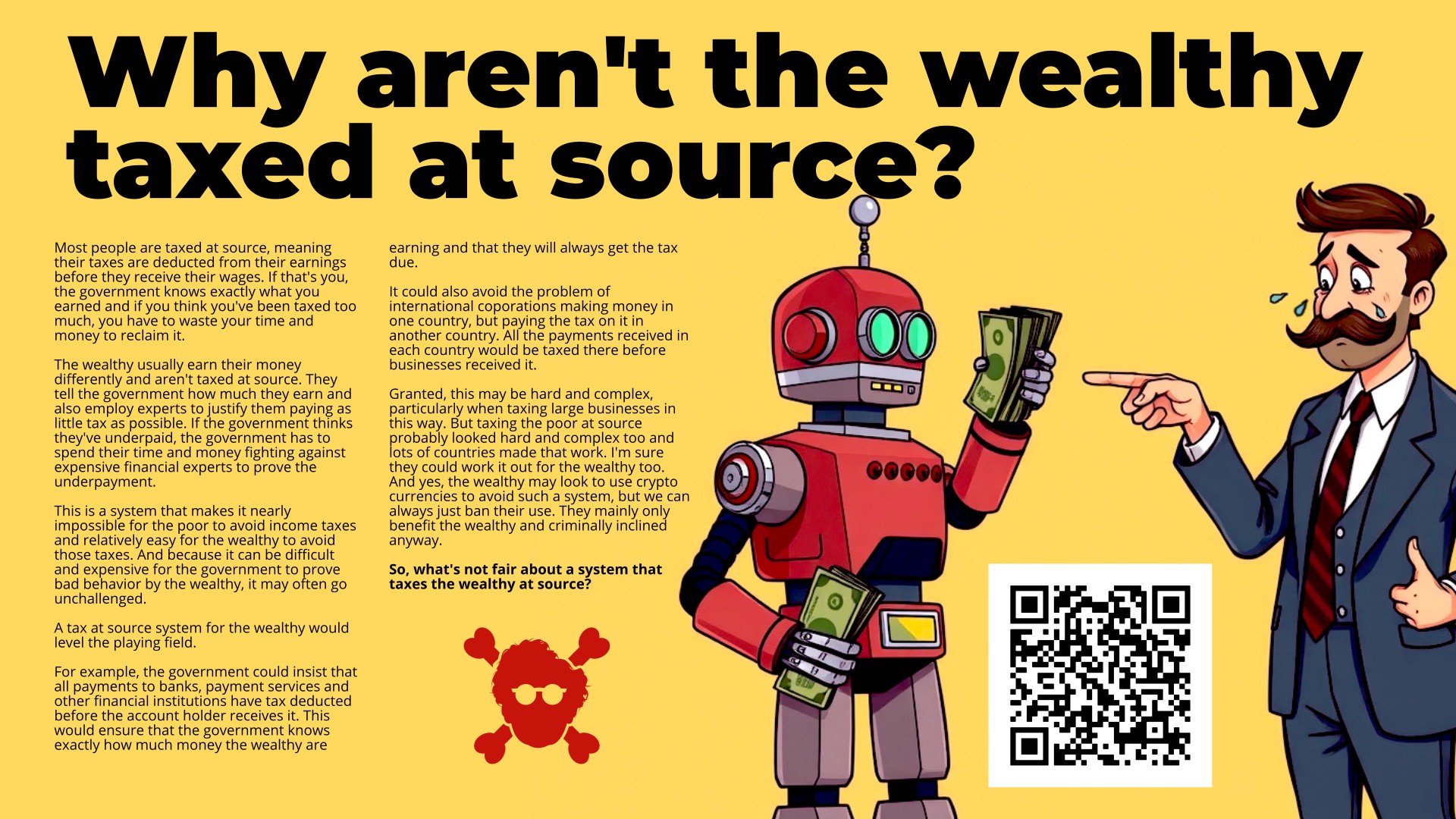 Granted, this may be hard and complex, particularly when taxing large businesses in this way. But taxing the poor at source probably looked hard and complex too and lots of countries made that work. I’m sure they could work it out for the wealthy too. And yes, the wealthy may look to use crypto currencies to avoid such a system, but we can always just ban their use. They mainly only benefit the wealthy and criminally inclined anyway.