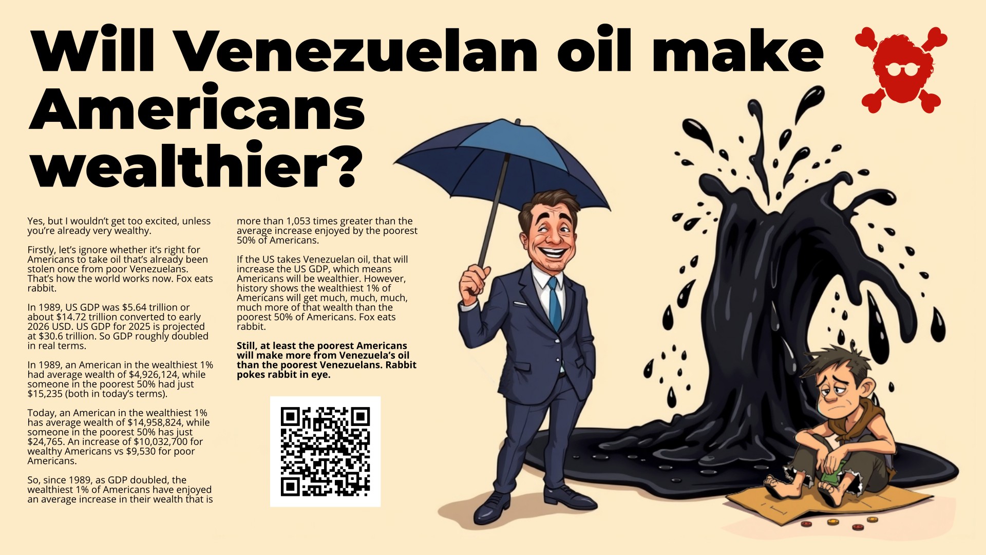 If the US takes Venezuelan oil, that will increase the US GDP, which means Americans will be wealthier. However, history shows the wealthiest 1% of Americans will get much, much, much, much more of that wealth than the poorest 50% of Americans. Fox eats rabbit.